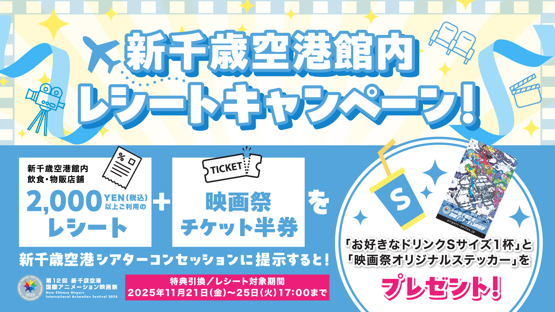 映画祭本祭期間中、新千歳空港館内飲食・物販店舗で【2,000円(税込)以上ご利用のレシート】と【映画祭チケット半券】を、新千歳空港シアターコンセッションに提示いただくと、「お好きなドリンクSサイズ1杯無料」!さらに、「映画祭オリジナルステッカー」もプレゼントします。
