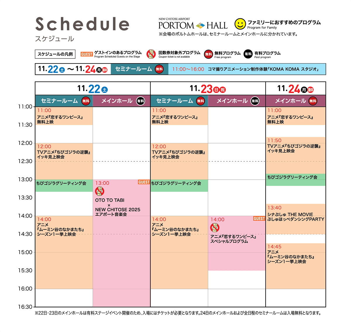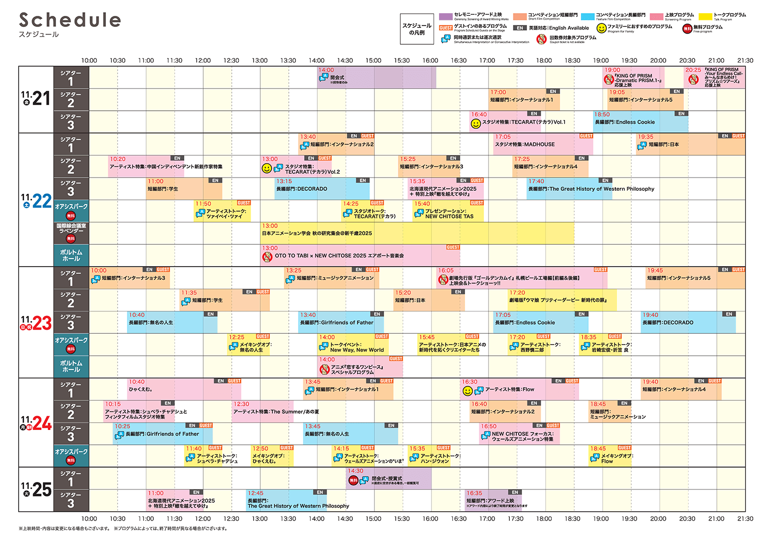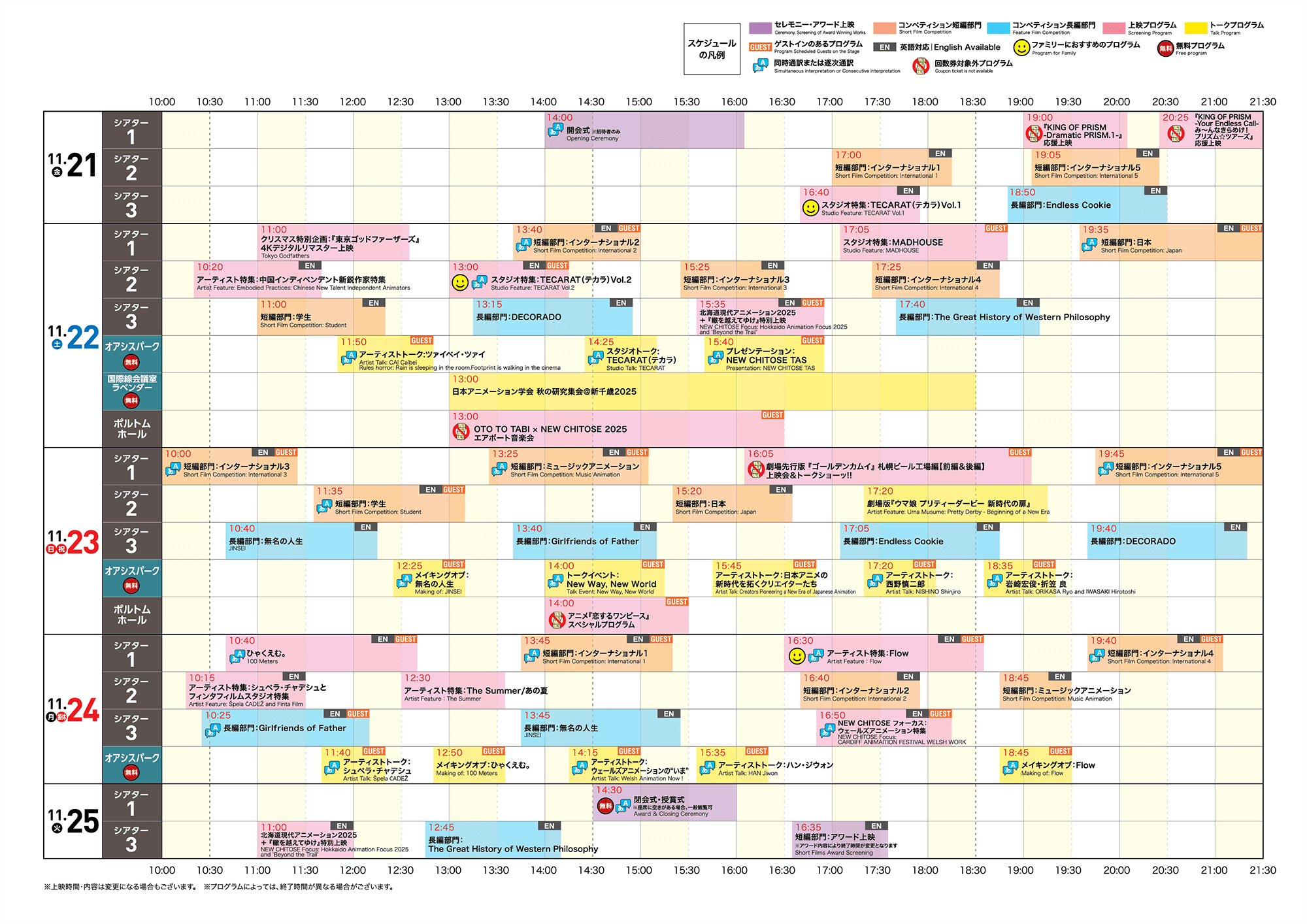 スケジュール ※上映時間、内容は変更になる場合もございます。 ※プログラムによっては、終了時間が異なる場合がございます。 タイムスケジュール ※画像をクリックするとPDFが表示されます。 NEW CHITOSE アニメパーク ※画像をクリックするとPDFが表示されます。